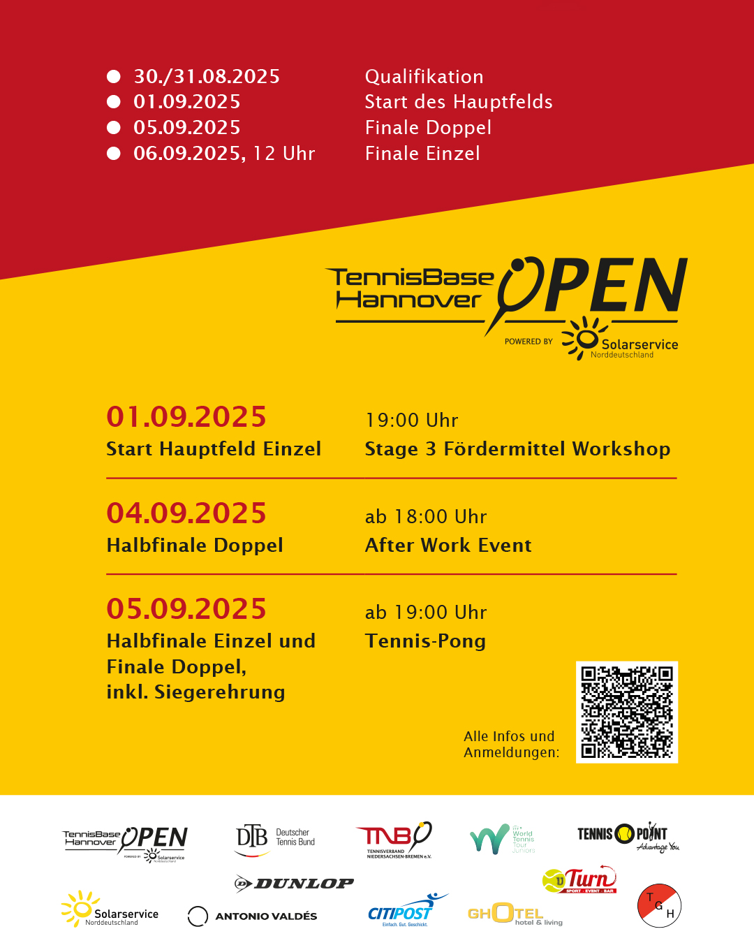 Mit großem Stolz dürfen wir verkünden, dass unsere Anlage vom 30. August bis 6. September 2025 zum Mittelpunkt des internationalen Jugendtennis wird. Die TennisBase Hannover Open powered by Solarservice Norddeutschland, einem ITF J60-Turnier, haben längst Tradition und bieten Nachwuchsspielerinnen und -spielern aus aller Welt die Gelegenheit, wichtige Weltranglistenpunkte zu sammeln. Für die Talente aus Niedersachsen und Bremen ist es das [...]